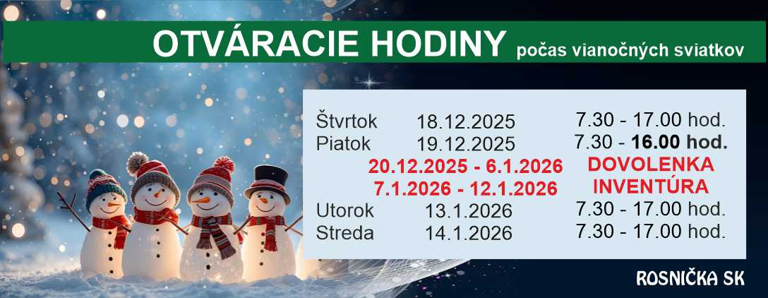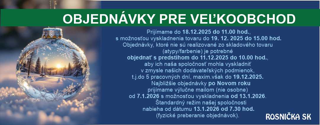 OBJEDNÁVKY prijímame do 18.12.2025 do 11.00 hod.,  s možnosťou vyskladnenia tovaru do 19. 12. 2025 do 15.00 hod. Objednávky, ktoré nie sú realizované zo skladového tovaru (atypy/farbenie) je potrebné objednať s predstihom do 11.12.2025 do 10.00 hod., aby ich naša spoločnosť mohla vyskladniť  v zmysle našich dodávateľských podmienok, t.j.do 5 pracovných dní, maxim.však do 19.12.2025. Najbližšie objednávky po Novom roku prijímame výlučne mailom (nie osobne) od 7.1.2026 s možnosťou vyskladnenia od 13.1.2026. Štandardný režim našej spoločnosti nabieha od dátumu 13.1.2026 od 7.30 hod. (fyzické preberanie objednávok).